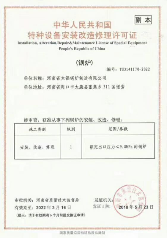 河南省太鍋鍋爐制造有限公司(原河南省太康鍋爐廠始建于1976年)始建于70年代初,經(jīng)40多年的艱辛探索,靠科技興業(yè),走科學管理之路,現(xiàn)已發(fā)展成為承接制造、安裝、設計大、中型供熱系統(tǒng),生產:SZS燃油燃氣蒸汽鍋爐、燃煤蒸汽鍋爐、燃油鍋爐、燃氣鍋爐、電加熱鍋爐、生物質鍋爐、茶水鍋爐、有機熱載體鍋爐、熱風鍋爐,蒸壓釜、燃油蒸汽鍋爐、燃氣蒸汽鍋爐、燃油熱水鍋爐、燃氣熱水鍋爐并承擔安裝120噸熱水鍋爐、蒸汽鍋爐,生物質鍋爐,加工制造一、二類蒸壓釜、壓力容器,化工機械的省一級**企業(yè)。